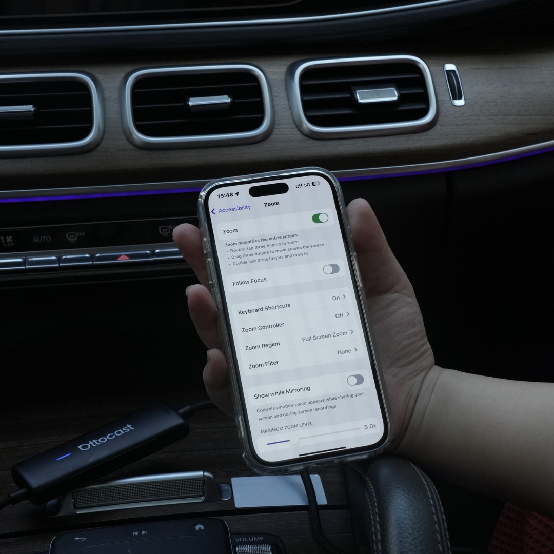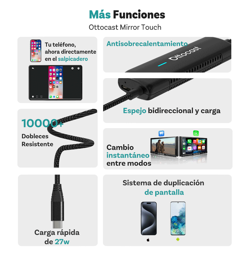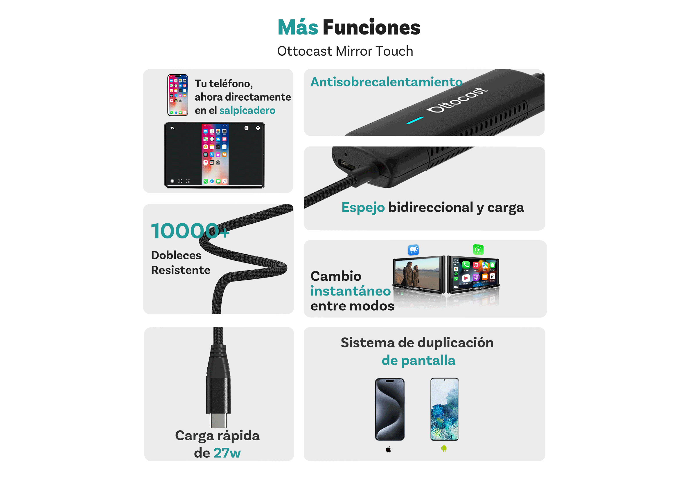 Ottocast Mirror Touch es compatible con smartphones Android que admiten duplicación de pantalla por DP (DisplayPort), así como ene iPhone 15 y 16. Esto permite reflejar la pantalla del teléfono de forma inalámbrica en la pantalla del coche.